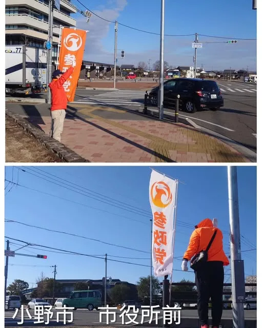 1月12日(月)、エクラホールにて執り行われました成人式にあわせて小野市役所前交差点で辻立ちを行ないました。成人が18歳からとなりましたので、成人式とは言わず、「はたちのつどい」のような名称に変わっている自治体もありましたが、小野市では「成人式」という呼称を残しているようです。従って、「新成人になられた皆さまへ」という章タイトルとさせていただきました。