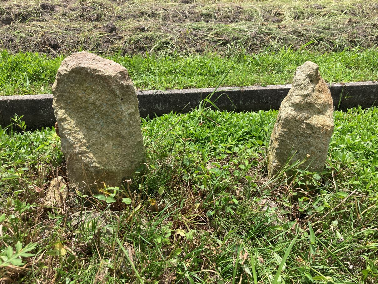 I氏一族が住んでいたのがムラの南側、K氏のお城があったのがムラの北側。そこでI氏の方々がお城に行くための道があったそうです。その道の途中であったろう場所に、古い石碑のようなものが現在でも残されています。雌雄(陰陽?)一対であることから道祖神だと思われます。ちなみにこの場所は字(あざ)荒神元といいます。現在は葉多町と王子町の境あたりにある荒神社は、元々はここあったそうです。平安時代(貞観年間)におきた山崎断層が震源とみられる播磨国地震で崩壊した後、現在の場所に移設されたのでしょう。同じく小野市の史跡である広渡町の広渡廃寺はこの地震で崩壊したと考えられています。
