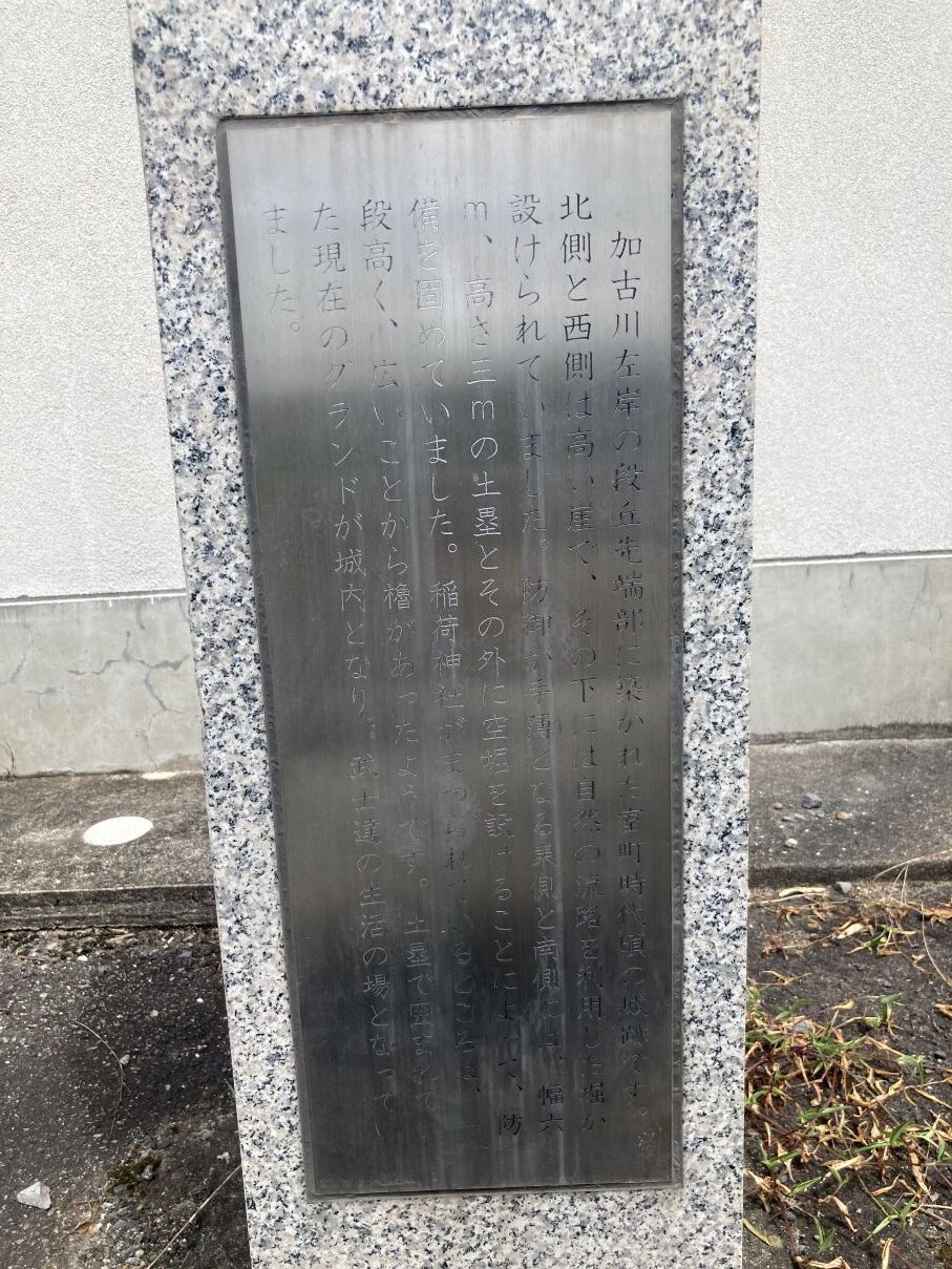 城跡は現在では芝生のグラウンドになっています。加古川東岸を見渡せる河岸段丘の端に位置しています。当記事のアイキャッチ画像は城跡から加古川方向へ向けて撮影した画像です。郷土史研究とかおもしろそうですね。やってみたいですね。