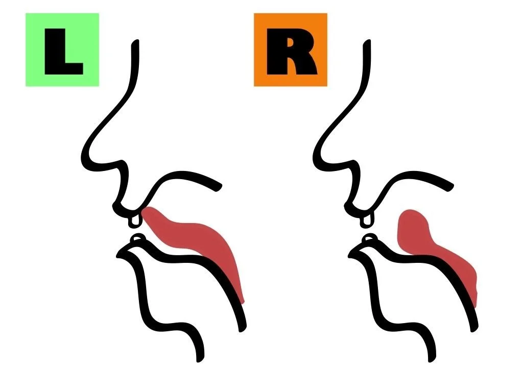 「R音」は日本語の子音にはない口舌の動きが必要です。下図のようにあきらかに舌の動きが違います。よく言われるのが舌を奥に巻き込むという動作です。実際英語圏話者は巻き込んでいるそうです。ただ僕は無理でした。できません。おそらく多くの日本人がそうでしょう。
